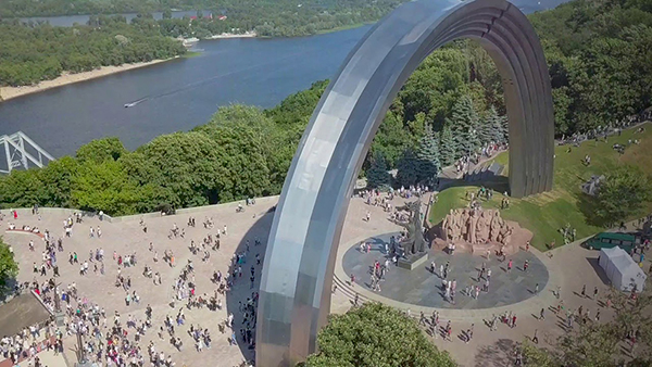 A new pedestrian tourist route leads from the Upper Town to the Pechersky Hill along the "Klitschko Bridge". Having crossed the bridge, tourists find themselves in front of a large-scale monument of the Soviet era, opened in 1982. This is the monumental Arch of Friendship of Peoples, which, according to the authors' conception, personified the "indestructible friendship" between Ukraine and Russia. The metal arch — 30 m in diameter — is complemented by a monument to two workers and the composition "Bohdan Khmelnytsky signs an agreement in Pereyaslav in 1654".