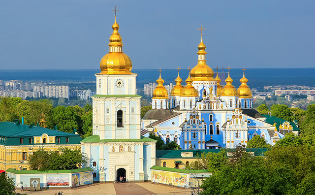 One of the most striking views in Kiev opens from St. Sophia Square to St. Michael's Cathedral — golden domes sparkle in the sun against the blue sky.